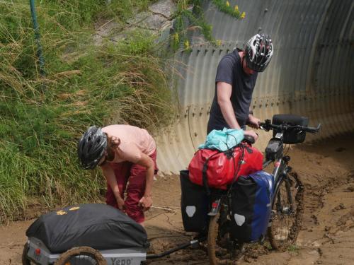 Dicke, große Tropfen fallen auf meinen Helm und laufen von dort weiter mein Gesicht herab. Ich kann den Weg vor Augen kaum noch erkennen. Wobei – welcher Weg? Dieser ist schon seit Tagen verschwunden. Stattdessen mäandert ein Fluß dort entlang, wo einst der Weg war. Hätten wir doch besser Schwimmflossen und Kanu einpacken sollen?