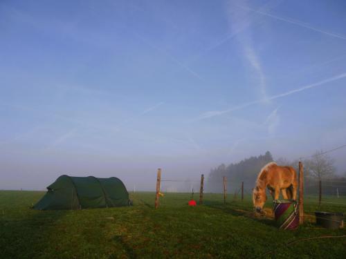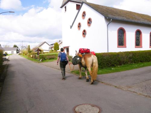 Die Bratkartoffeln zahlen sich aus. Die Eifel ist wunderschön, bisweilen aber auch recht steil und geradeaus gibt es auf den Wanderwegen ohnehin nicht. Es ist Anfang April und wir haben strahlenden Sonnenschein, der uns die noch immer sehr frostigen Nächte um diese Jahreszeit schnell wieder vergessen lässt. Die Landwirte und Wanderreithofbesitzer verköstigen und verwöhnen uns mit Brennnessellasagne, Marshmallow-Lagerfeuer und jede Menge Heu für William. Wir sind selig. Unsere erste längere Trekkingtour mit unserem William wird ein voller Erfolg. Von Prüm aus starten wir und erreichen nach zwei Wochen im Zickzack und über eine Schleife durch Belgien Simmerath. William trägt seinen Packsattel vollgepackt mit unserem Zelt, Schlafmatten, Kocher, Wechselklamotten und natürlich seinem Futter vorbei an knallgelben Narzissen, die zu Zehntausenden am Wegesrand blühen, und mit nur einem Tag Regen haben wir wirklich nicht gerechnet. So kann es auf der nächsten Tour gerne weitergehen.